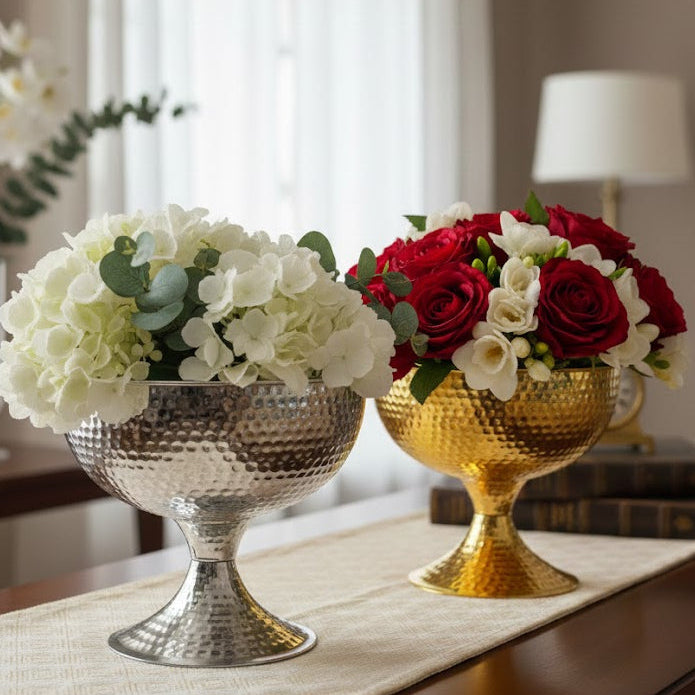 v dekorasyonunuza zarafet katacak dövme metal vazo ve sunumluk seti ile tanışın. Hem modern hem de klasik dokunuşları bir arada sunan bu özel tasarım, altın (gold) ve gümüş (silver) renk seçenekleriyle yaşam alanlarınıza ışıltı getirir.