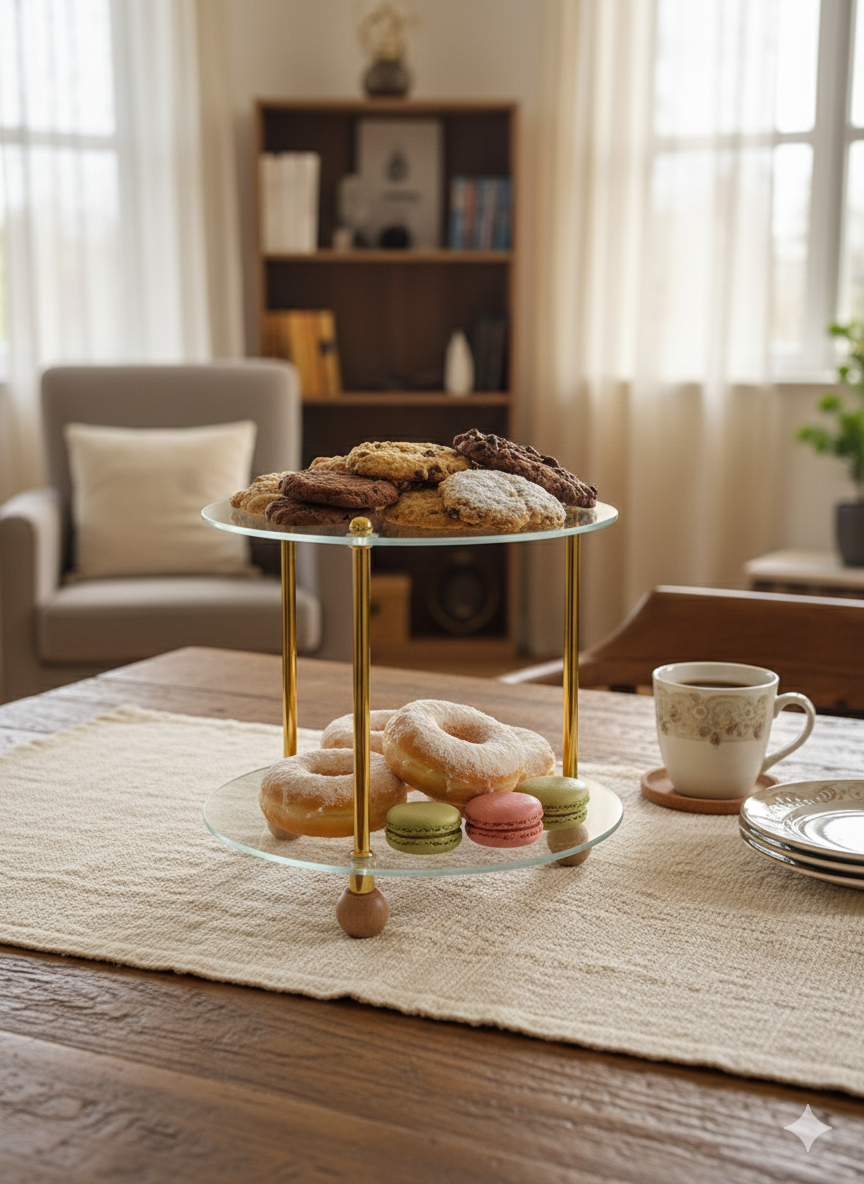 VAZO DEKOR Gold Detaylı 2 Katlı Lüks Cam Kurabiyelik ve Atıştırmalık Sunumluk - Modern Ev Dekorasyonu