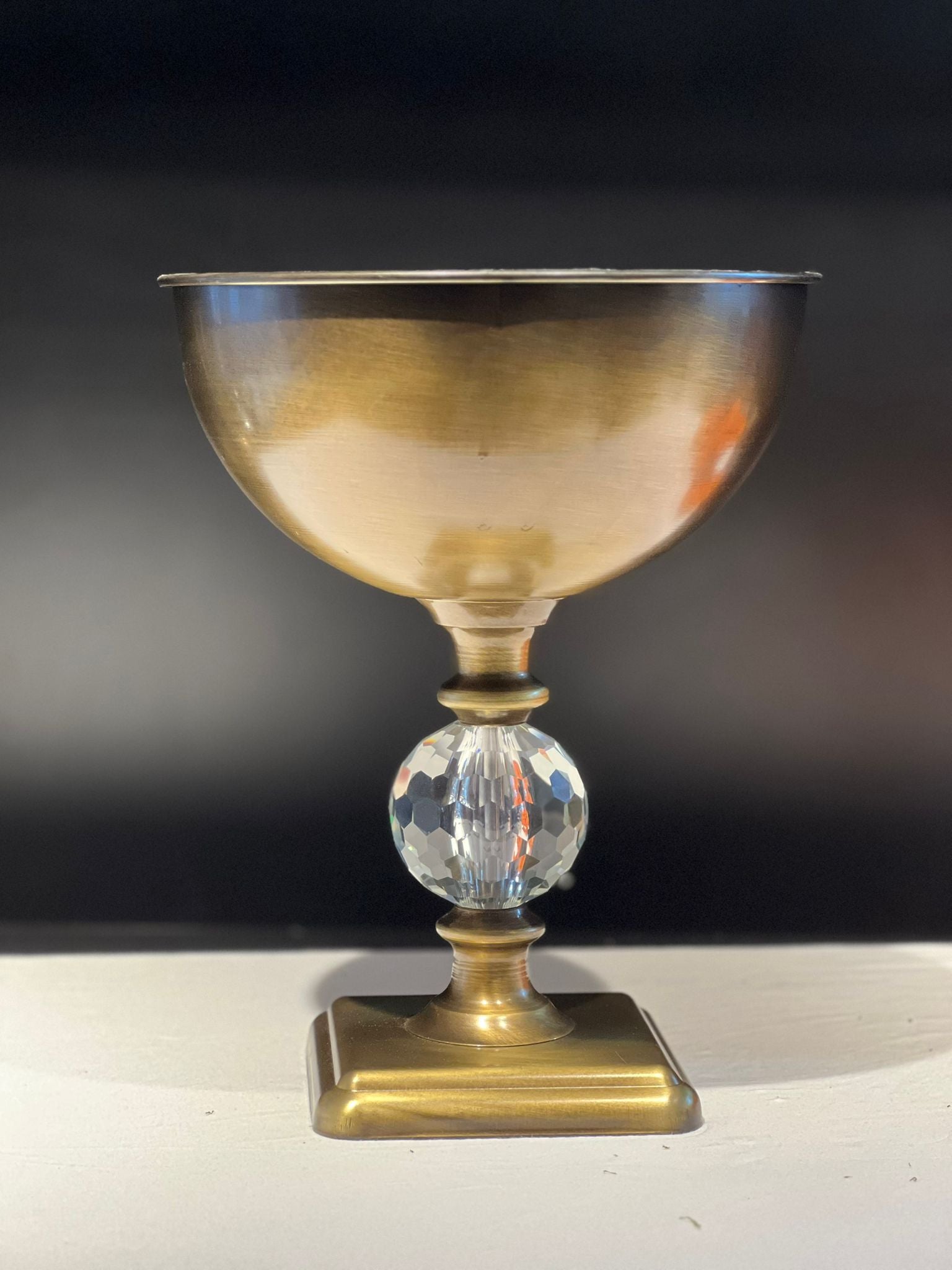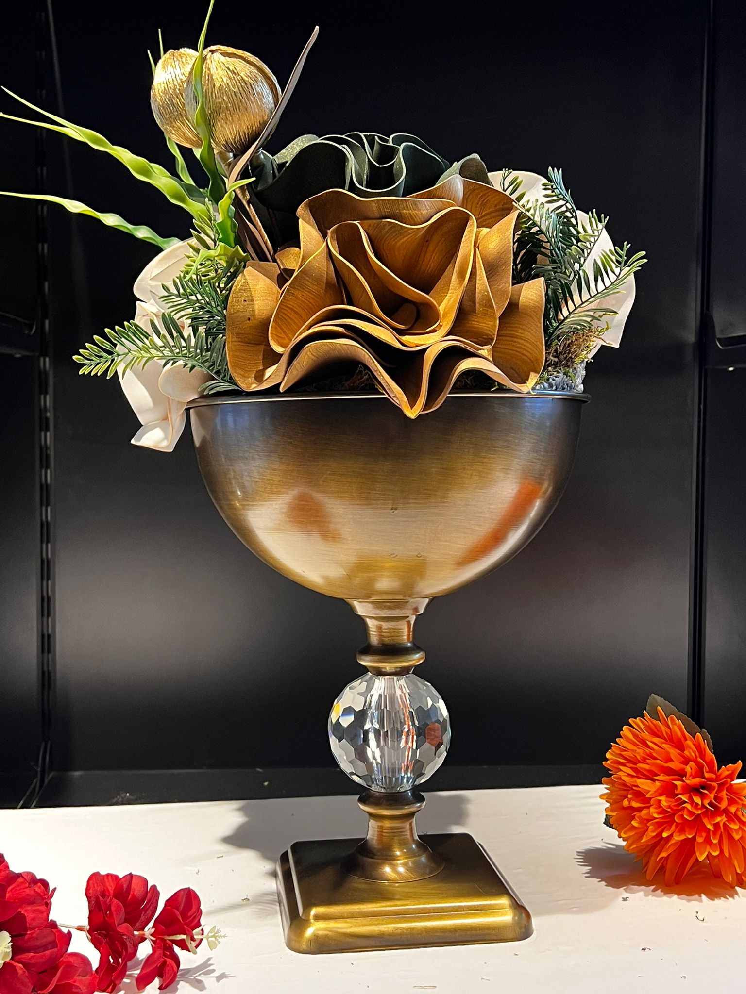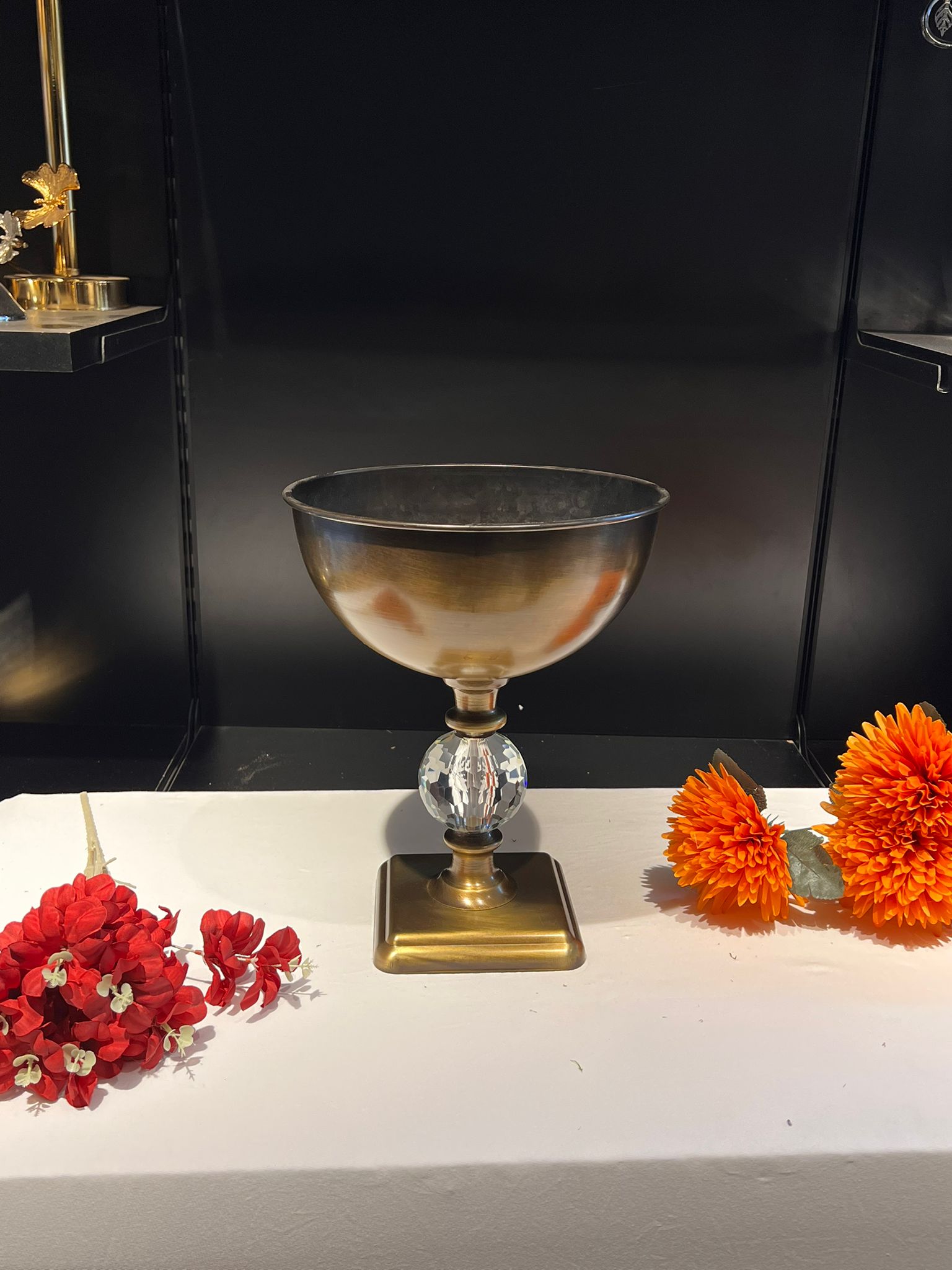 VAZO DEKOR Kristal Gövdeli Eskitme Metal Sunumluk ve Çiçek Vazosu