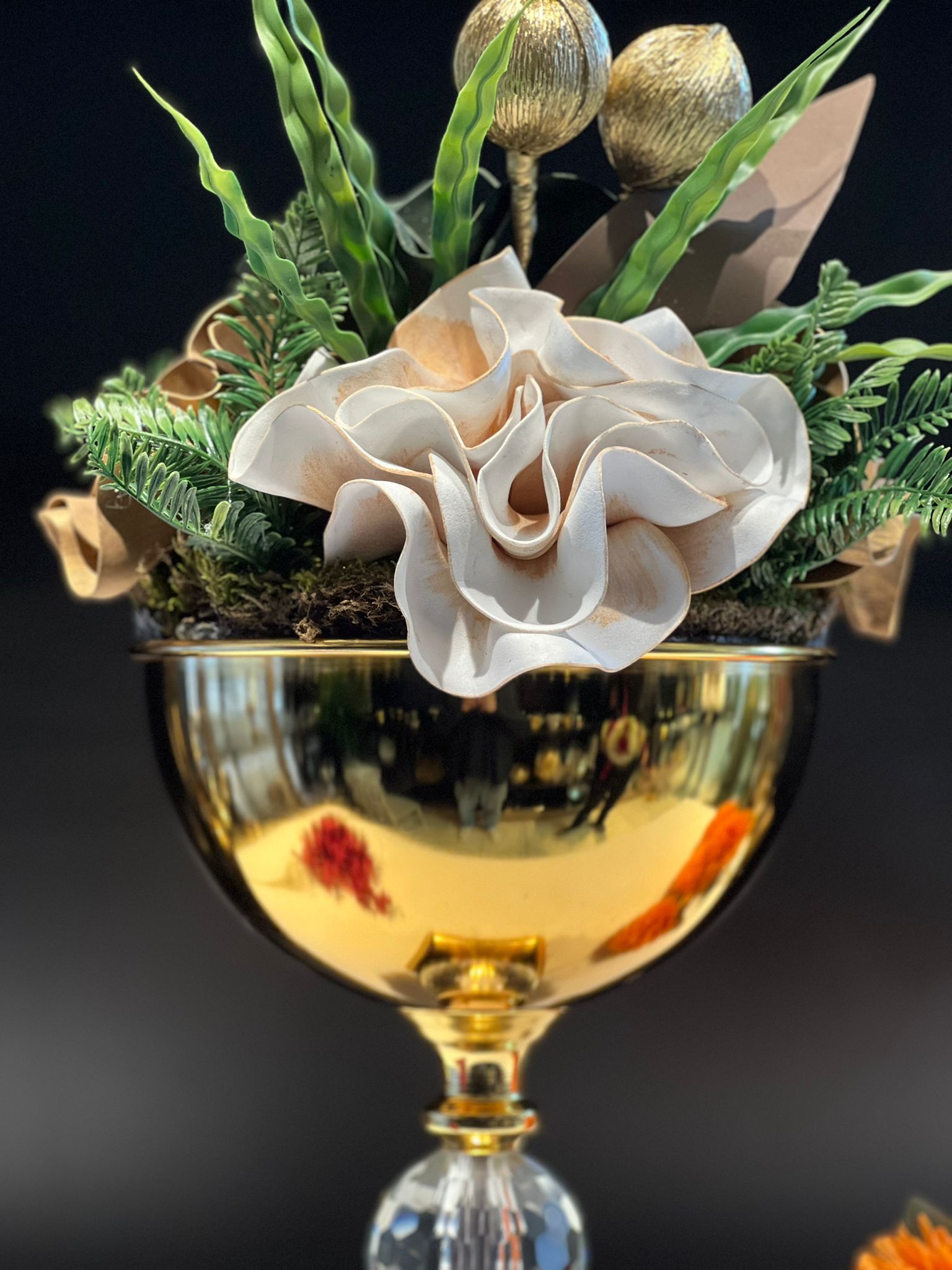 : dekoratif vazo, pirinç kupa, kristal dekorasyon, lüks ev aksesuarları, salon dekoru, eskitme gold, masa üstü objeleri, vintage vazo, centerpiece, hediyelik eşya.